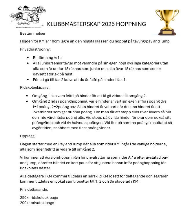 Under året kommer ridskolan regelbundet hålla pay and jumps vilka planeras sista lördagen varje månad men det kan såklart diffa vid tävlingar eller andra arrangemang.. De planerade datum kommer att läggas in här på sidan när de är fastställda.